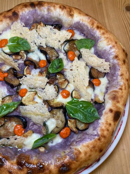 Fiordilatte, crema di patate viola, zucchine, melanzane, crema di peperoni, cialde di grana padano DOP, basilico, olio EVO