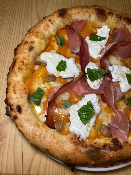 Provola, crema di zucca, speck dell’Alto Adige DOP, funghi porcini saltati, stracciata di bufala, basilico, olio EVO aromatizzato al rosmarino